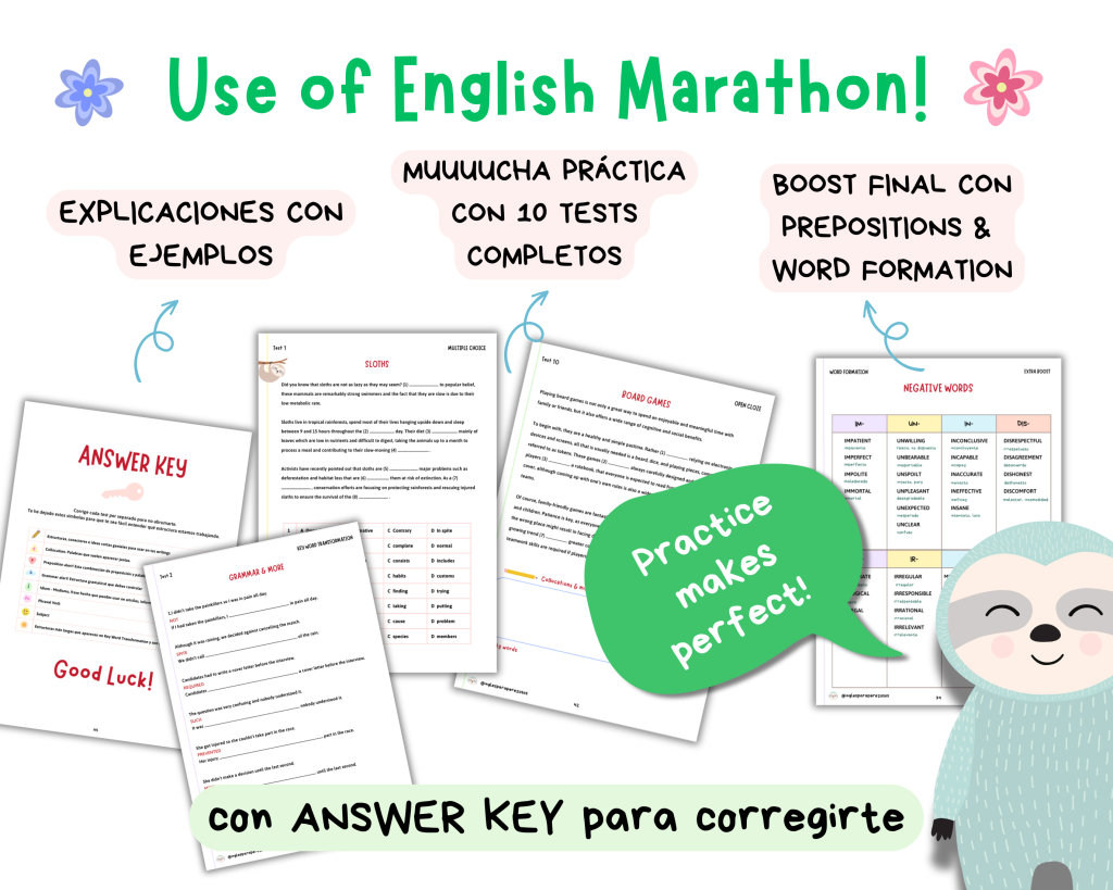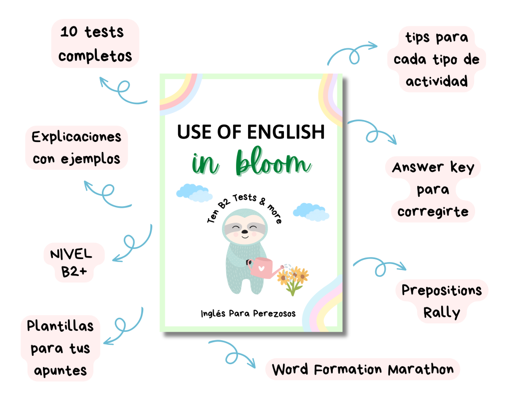 🌼 10 tests completos de Use of English con cuatro ejercicios por test: Multiple Choice (que te contará como puntos en tu Reading), Open Cloze, Word Formation and Key Word Transformation.